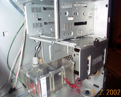 Der Flüssigkeitsbehälter verfügt über 2 fast geräuschlos arbeitende Pumpen. Die linke arbeitet einpumpend, die hintere rechte abpumpend. Damit ist genügend Systemdruck und Förderleistung sichergestellt. Am Behältnis selbst sind minimal und maximal Pegelanzeigen angebracht, ebenso eine Einfüllmarke. Zum Einfüllen wird der Tower einfach auf den Kopf gestellt und mittels Trichter die Flüssigkeit eingefüllt.