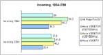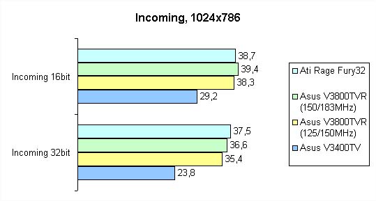 Bei einer Auflösung von 1024×768 zeigt sich auf dem schnellen Prozessor ganz klar, wer der Herr im Hause ist. Der TNT2lässt hier seine Mitstreiter unterm 3D Mark99 MAX doch schon weit hinter sich. Dies zeigt auch, wie stark dieserGrafikprozessor von der Leistung des eigentlichen Prozessors abhängt. Im D3D Test unter Incoming mit einem PII 333MHz kann man durchaus noch von Gleichstand aller Karten sprechen, aber mit einem PIII 500 MHz fällt das Augenmerknun ganz klar auf die TNT2, die nun ihre Power entfaltet. Die OpenGL Leistung glänzt zwar schon selbst auf demlangsamen Prozessor mit hervorragenden Werten, kann aber auf dem PIII noch etwas zulegen. Bei den anderen Modellen isthier Schicht. Vor allem unterm Belastungstests (3Fingers Crusher Demo) bleiben die Werte auf höherem Niveau, welchernormal den Knackpunkt vieler Karten aufzeigt.