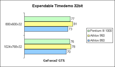 Eine große Überraschung erwartete uns! Der Athlon 950 liegt in Expendable unabhängig von Farbtiefe und Auflösung immer vor dem schneller getakteten Pentium III! Die Unterschiede wirken sich zwar nicht auf die Spielbarkeit aus, sind aber durchaus signifikant!