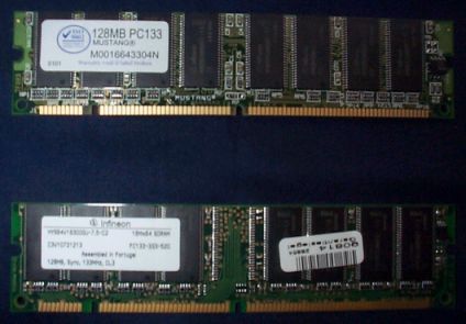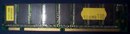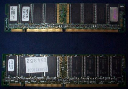 Diese sind mit 8x16MB Chips einseitig auf der Platine bestückt. Als Besonderheit weisen diese „Goldkontakte“ auf und sind mit 150MHz spezifiziert bei CAS 2-2-2.