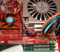 Etwas eng geht es um den Prozessorsockel zu. Bei einem ausladenden Kühler wie dem von uns eingesetzten PowerCooler PCW192H bleibt wenig Platz für die Stromanschlüsse, die direkt am Retentionmodul platziert sind. Es geht aber alles ohne Verbiegen von statten.