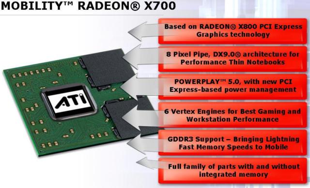 Weitere Features des Mobility Radeon X700 sind: DirectX 9.0 Architektur, sechs Vertex Engines, Unterstützung von GDDR3 Speicher und flexible RAM-Konfigurationen. Der Notebook-Hersteller kann auswählen, ob er den MR X700 ohne eigenen Grafikspeicher oder mit z.B. integrierten 64MB oder auch 128MB Grafik-RAM verwenden möchte.
