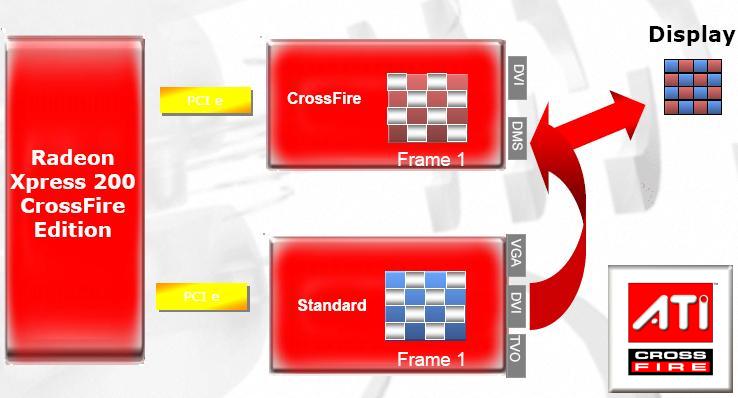 Für den Parallelbetrieb zweier ATI-Produkte wird eine “Radeon CrossFire Edition“ Grafikkarte als sogenannte “Master-Card“ benötigt. Diese ist neben einem herkömmlichen DVI-Anschluss ausgestattet mit einer High-Density DMS Schnittstelle (DMS-59). Über diese wird – mit einem externen ‚Dongle‘ – die sogenannte “Slave-Card“ angeschlossen, die die “Master-Card“ beim Bildaufbau unterstützt. Die Master-Karten sind zusätzlich zu den normalen Grafikchips mit der “CrossFire Compositing Engine“ ausgestattet, die die von den beiden Grafikkarten erzeugten Bilder kombiniert und zum Monitor schickt.