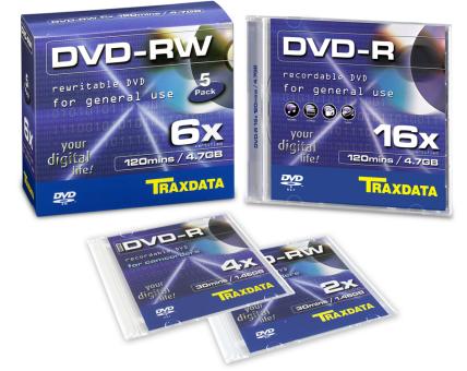 Das Highlight des erweiterten Sortiments ist das innovative DVD-R 16X Medium, welches die DVD-Brennzeit extreme verkürzt. Traxdata’s DVD-R 16X Rohlinge können mit einem maximalen Datendurchsatz von bis zu 21 MByte pro Sekunde beschrieben werden, somit ist ein 4,7 GByte-Medium in nur 6 Minuten fertig gestellt.