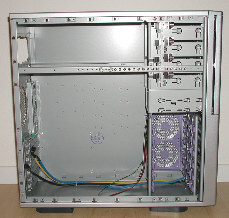 Die Festplatten befinden sich nicht mehr in Käfigen, sondern in einem großen Schacht, der zur Seitentüre ausgerichtet ist. Dieser kann maximal sechs 3,5’’ Festplatten aufnehmen. Insgesamt können bis zu drei 90x90mm große Lüfter zum direkten Kühlen der Festplatten eingesetzt werden.