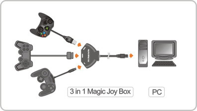 Der 3-in-1-Adapter hat Anschlüsse für Controller der PS1, PS2, Xbox und des GameCubes. Es lassen sich drei Controller gleichzeitig anschließen, aber immer nur einer davon aktiv einsetzen. Zum Spielen mit mehreren Controllern gleichzeitig braucht man also auch mehrere Adapter. Spezielle Features der Controller wie beispielsweise Vibrationen unterstützt das Gerät auch.