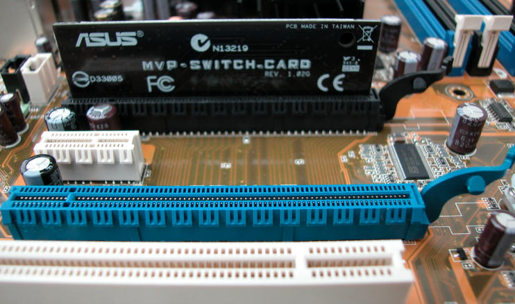 Für die automatische Erkennung des Grafikkarten-Modus liegt eine kleine PCI Express Karte bei, die bei Einsatz von nur einer Karte in den schwarzen Slot gesteckt wird und damit dem blauen Slot die volle x16-Bandbreite des Busses zur Verfügung stellt. Bei Einsatz von zwei Grafikkarten teilt sich die Bandbreite auf jeweils x8 pro Slot auf. Ebenfalls wieder dabei: Der bekannte EZPlug-Anschluss zur Extra-Stromversorgung im Crossfire-Modus.