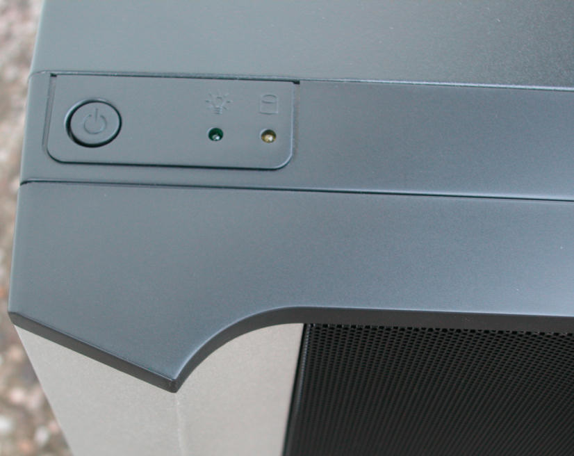 Weiteres interessantes Detail: Der Power-Knopf befindet sich auf der Oberseite vorn. Damit sollte er unabhängig von der Tür immer gut erreichbar sein. Gleich daneben HDD- und Power-LED, der Reset-Taster befindet sich geschützt hinter der Fronttür auf der linken Seite. An der linken Seitenwand befinden sich mit Plastikringen versehene Löcher. Das peppt nicht nur das Design etwas auf, sondern hat durchaus Funktion: Durch diese Löcher kann man von außen die Schrauben der Laufwerke lösen, zumindest eine Schraube pro Laufwerksseite, was aber für einen festen Sitz reichen sollte.