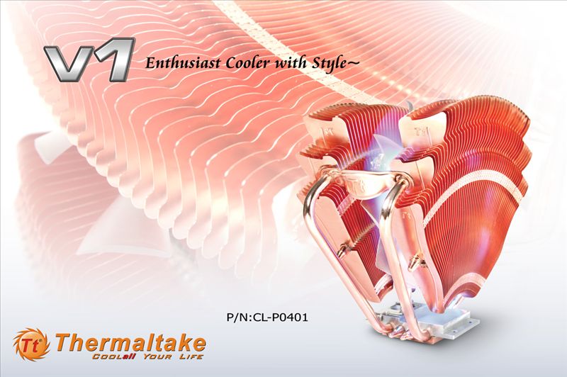 March, 2007 – Thermaltake, the world’s leading manufacturer of high-end PC chassis, high-efficiency power supply and CPU cooling solution, today announced the next generation of ultra-high performance CPU cooler, V1. Designed for outmost thermal efficiency while minimizing the overall noise output to provide unprecedented computing environment and comfort. V1 will support all mainstream and high performance processors (Intel LGA775 and AMD Socket AM2/940/939/754).
