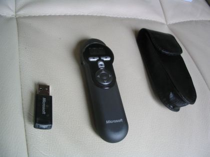 Der Lieferumfang des Microsoft Presenters entspricht exakt dem des bisherigen Topmodells von Logitech: Presenter, Receiver, Etui, Batterien und Schnellanleitung. Positiv auffallen tut beim Produkt von Microsoft aber das Kunstlederetui. Logitech setzt nur auf Stoff.