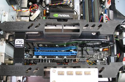 Auffällig ist hier zum Einen das großzügig dimensionierte Netzteil, zum Anderen natürlich das SLI-Gespann aus zwei GeForce 8800 GTX Grafikkarten. Festplatten sind drei Stück verbaut: Zwei Raptoren im RAID und eine 500GB-Datenplatte. Oberhalb der Grafikkarten lässt sich die aktiv ventilierte Northbridge des 680i SLI-Chipsatzes ausmachen.