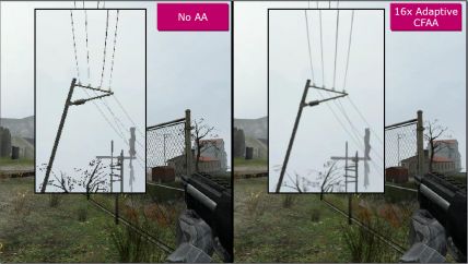 Ein weiteres neues Feature ist neben der Unterstützung von jetzt 8x Multisampling AA (bislang max. 4x) der neue Kantenglättungsmodus mit dem Namen „Custom Filter Anti-Aliasing“ (CFAA). Dieser ist bezüglich Muster und Filter programmierbar und kann über neue Treiberversionen optimiert und erweitert werden. CFAA bietet einen adaptiven Kantenerkennungsfilter (Edge Detect), der Kanten in bereits fertig berechneten Bildern erkennt und in hoher Qualität glättet. Andere Pixel ohne Kanten werden dagegen im Standardverfahren verarbeitet, was die Leistungseinbußen reduziert. CFAA ist bis zu 24x möglich und soll eine bessere Qualität bei höherer Performance bieten als Supersampling.