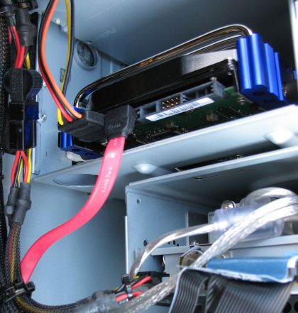 Die schon ab Werk relativ leise Samsung-Festplatte wurde wie üblich bei einem Besser-Leise-System mit einem Zalman Passivkühler versehen und entkoppelt unter den optischen Laufwerken montiert.
