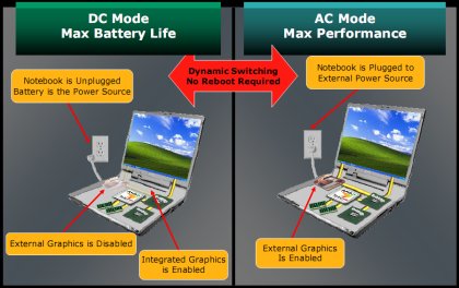 Dabei kann sozusagen On-the-Fly zwischen dem integrierten Grafikchip und einer per PCIe 2.0 angebunden Zusatzkarte gewechselt werden. Ein Neustart ist nicht notwendig, die Ansteuerung des Displays wird auf der Stelle von der gewünschten Grafiklösung übernommen. Der Wechsel soll per Utility möglich sein oder automatisch geschehen, zum Beispiel wenn das Notebook im Akkubetrieb läuft. Damit hat AMD einen Kompromiss zwischen Grafikleistung und Mobilität gefunden, der den Notebooks neue Anwendungsbereiche eröffnet.