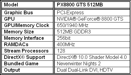 With the latest Microsoft® DirectX® 10 with full Shader Model 4.0 support, PX8800 GTS 512MB is able to deliver realistic gaming effects with film-quality, and provide users with a more amiable environment under the Windows Vista™ operating system.