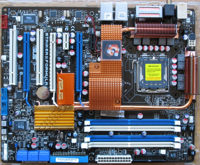 Die Kühlrippen rund um den CPU-Sockel weisen relativ viel Abstand auf, so dass alle gängigen CPU-Kühler montierbar sein dürften. Hier empfiehlt es sich dennoch im Einzelfall immer nachzumessen bzw. sich vorab zu informieren. Ansonsten kann man nicht viel beanstanden. Die Anschlüsse liegen wieder allesamt gut erreichbar und SATA- sowie IDE-Ports sind nach außen hin abgewinkelt, was der Kabelführung im Gehäuse zugute kommt.