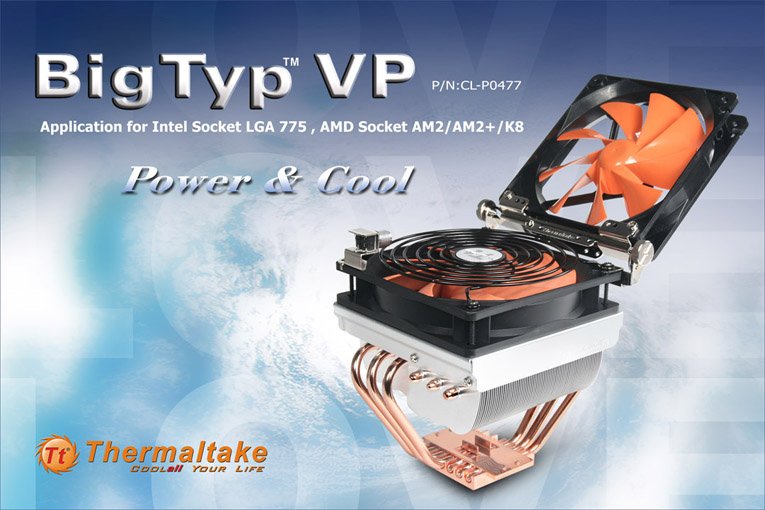 March,2008 – The superior performance and silence of the famous Thermaltake BigTyp 120 VX (P/N: CL-P0310-01) has received numerous recognitions from gamers and media around the world, and Thermaltake introduces the new upgraded value pack of this classical air cooler, BigTyp VP (P/N: CL-P0477). BigTyp VP not only maintained the same excellent thermal structure of the original BigTyp but added on one extra 120mm satellite fan, and thus enabled the simultaneous cooling of CPU surrounding chipsets.