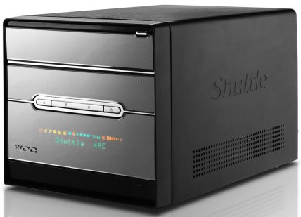 Dazu kommen WLAN, ein DVB-T TV-Tuner, ein 25in1 Kartenlesegerät sowie eine Fernbedienung. Ein Farbdisplay an der Gehäusefront unterstützt letztere. Shuttle liefert dieses System zusammen mit Windows Vista aus.