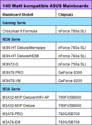 ASUS hat als erster Hersteller eine Liste herausgegeben, auf der zahlreiche Mainboards gelistet werden, die Prozessoren mit einer TDP von 140 Watt unterstützen. Gemeint ist damit natürlich in erster Linie AMDs Phenom X4 9950 mit 2,6 GHz, der mit einer derart hohen Verlustleistung an den Start gehen wird. ASUS gab außerdem bekannt, die Liste in absehbarer Zeit noch zu ergänzen.