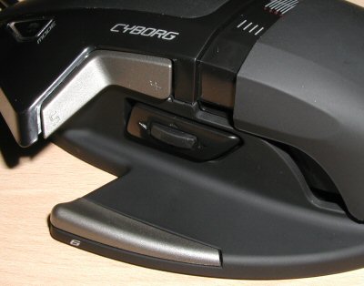 Rechtsseitig besitzt die Cyborg keine Tasten, dafür ist die Ausstattung auf der linken Seite um so üppiger. An der oberen Aussparung sitzen die zwei Standard-Seitentasten, wie man sie auch von anderen Mäusen kennt.