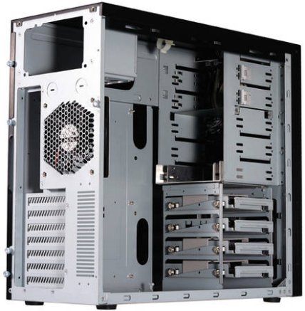Hinten befindet sich ein 120 mm Auslassventilator mit 1.000 Umdrehungen pro Minute, der Lüfter vorne dreht mit 900 UPM und hat einen Durchmesser von 140 Millimetern. Bis zu vier Festplatten lassen sich in der werkzeuglosen Antivibrationsaufhängung unterbringen.