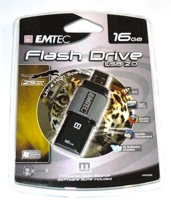 Die Verpackung des Emtec FlashDrive USB 2.0 S400EM 16 GByte klärt den Kunden über Kapazität, Garantiezeit (5 Jahre) und maximale Lesegeschwindigkeit von 25 MByte/s auf. Außerdem sind auf dem rund 70 Euro teuren Stick einige Open Source Programme wie Mozilla Firefox und Mozilla Thunderbird sowie Open Office und VLC vorinstalliert. Auf der Rückseite wird einem in 15 verschiedenen Sprachen erklärt, dass der USB-Stick einen einfachen Datenaustausch zwischen „PCs, Notebooks und Macs“ ermöglicht. Die Blister-Verpackung hat eine für USB-Sticks durchschnittliche Größe und ist wie die meisten solchen Verpackungen verschweißt.