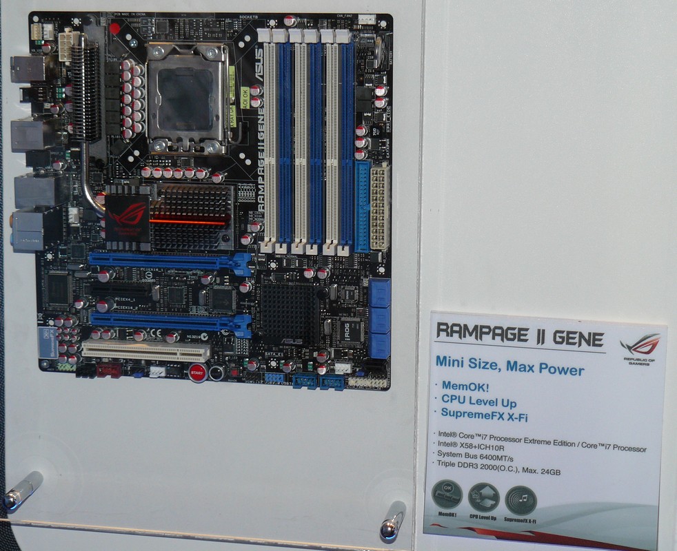 Das ASUS Maximus II Gene ist die kompakte Variante des Maximus II Formula mit Intel P45 Chipset. Unterstützt wird bis zu 16 GByte Dual-Channel DDR2-1200 und CrossFire-Konfiguration mit zwei ATI Radeon Grafikkarten. Ein solches System wurde auf der CeBIT auch im laufenden Betrieb gezeigt.