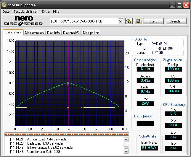 Im Nero DiscSpeed Benchmark bei DVD-Medien ist Sony nicht der eindeutige Sieger. Der LG hat hier deutlich bessere Zugriffszeiten und auch die CPU-Belastung ist so gut wie identisch. Nur die Erkennungszeit ist noch leicht schlechter als beim Sony BWU-300S.