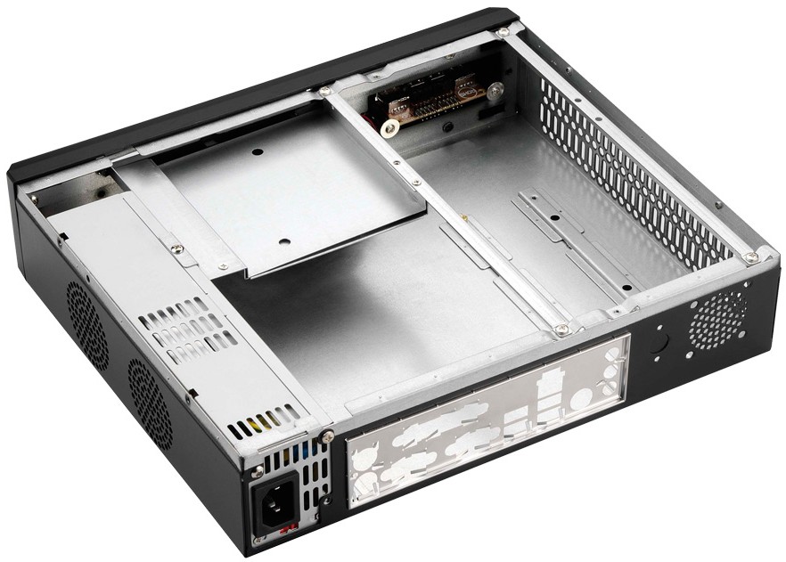 Das Innere bietet Platz für ein Mini-ITX-Mainboard, eine 3,5“ Festplatte und ein Slimline-Laufwerk. Das 150W Netzteil versorgt mühelos jedes ITX-Mainbaord mit genügend Energie und bleibt dabei angenehm leise. Direkt über dem Prozessor befindet sich ein Luftfilter, der die sensible Minitechnik zuverlässig vor Schmutz schützt. Im Heck findet man den Stromanschluss und einen Luftauslass für einen optionalen 40mm Lüfter.