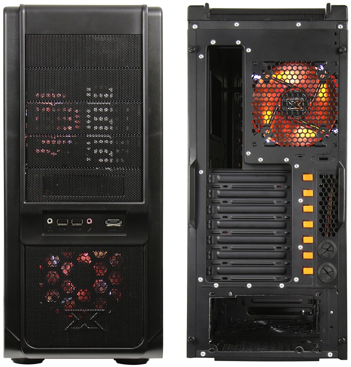 Die fünf 5,25-Zoll-Laufwerkeinschübe des Xigmatek Midgard besitzen Schnellverschlüsse für eine schraubenlose Montage und Blenden im Mesh-Design. Das I/O-Panel ist mittig untergebracht und verfügt über die üblichen Anschlüsse inklusive eSATA. Der Frontlüfter ist beleuchtet und besitzt darüberhinaus orange gefärbte Rotorblätter. Der Innenraum ist komplett schwarz lackiert. Sowohl im linken Seitenteil als auch unter der Oberseite können zwei 120- oder 140-mm-Lüfter eingebaut werden.