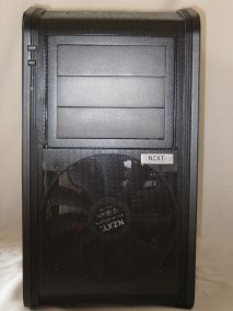 Die Front besteht bis auf die Frontblenden ebenfalls aus schwarzem Lochblech, auch hier leider ohne Staubfilter, obwohl hinter der Front ein ansaugender 190-mm-Lüfter sitzt. Oben neben den Laufwerksblenden befinden sich Reset- und Power-Knopf und unter den Blenden noch ein aufgeklebtes Herstellerlogo.
