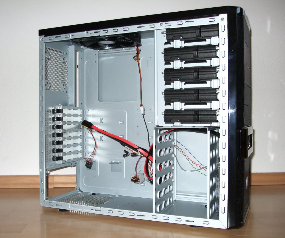 Bis zu fünf Festplatten lassen sich im großzügig dimensionierten Rahmen verstauen. Ein 12-cm-Lüfter sorgt für die nötige Kühlung der Massenspeicher.