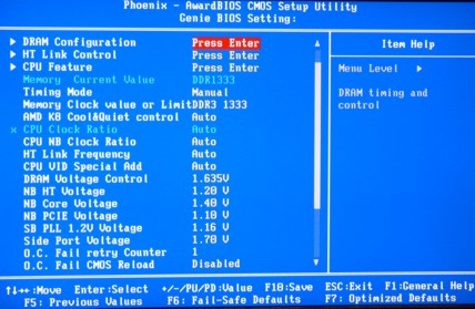 DFI bringt unter dem Menüpunkt „Genie BIOS Setting“ sämtliche wichtige Einstellungen in Bezug auf Overclocking und Speicher unter. Dieser Menüpunkt ist wiederrum in drei Untermenüs und einigen Basiseinstellungen unterteilt. Die drei weiteren Untermenüs nennen sich: „CPU Feature“, „DRAM Timing“ und „HT Link Control“. Direkt in dem „Genie“ Menü befinden sich die Einstellungen für sämtliche Multiplikatoren, Taktraten und Spannungen. Um alle Optionen nutzen zu können, muss dies zuvor mit der [F9]-Taste aktiviert werden. Außerdem stellt DFI auf seiner Website wieder eine ausführliche Erklärung der einzelnen Einstellungen in Englisch zur Verfügung. Dies sollten auch einige andere Hersteller mal einführen.