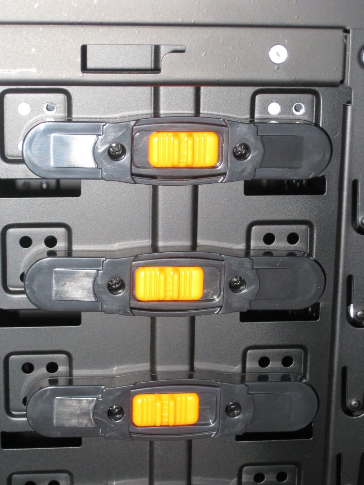 Das optische Laufwerk wird von vorne durch die Front geschoben, wofür diese aber entfernt werden muss. Obwohl die Anschlüsse in der Front liegen, lässt sich die gesamte Front entfernen, da sich Ein- und Ausgabe-Ports in einem separaten Teil befinden. Das Laufwerk wird anschließend auf beiden Seiten mit den Schnellverschlüssen befestigt.