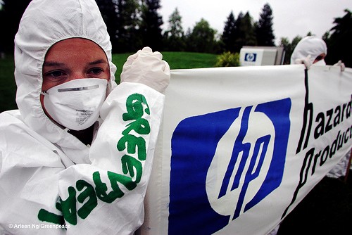 Greenpeace-Aktivisten sind auf das Dach der Zentrale von PC-Hersteller Hewlett Packard in Kalifornien gestiegen und haben dort den Schriftzug „Hazardous Products“ (gefährliche Produkte) hinterlassen. Außerdem lässt Greenpeace HP-Mitarbeiter per Automat anrufen und spielt ihnen eine Sprachbotschaft von Schauspieler William Shatner (Captain Kirk) vor, mit der die Angestellten die Chefs von HP zum Einhaltung ihrer Versprechen bewegt werden sollen. Es geht um die Reduzierung von giftigen Stoffen in PCs und Druckern von HP.