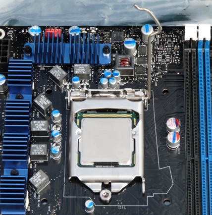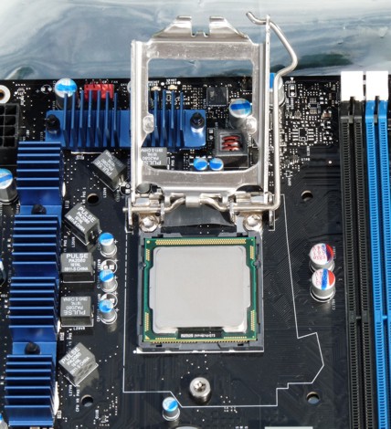 Nun kommen wir noch zu einer kurzen Bilderserie der neuen CPU-Halterung. Die Kontakte sind genauso aufgebaut wie bei den schon bekannten Sockel 775 und Sockel 1366 Systemen. Die CPU muss dort nur passend hineingelegt werden: