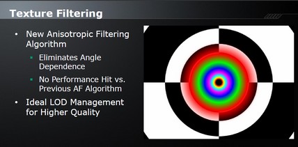Nach eigenen Angaben hat AMD auch die Verarbeitung des anisotropen Filters (AF) bei den neuen Grafikchips verbessert. Der nun verwendete Algorithmus soll die Winkelabhängigkeit ausschalten und dabei nicht langsamer sein als bisherige AF-Techniken.