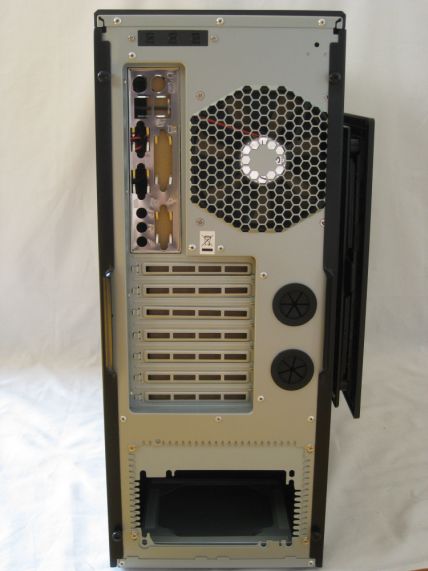 Das Netzteil wird beim P193 in einer Kammer unten im Gehäuse verbaut. Über dem Netzteil befinden sich die Slotblenden und zwei Ausgänge für den Schlauch einer Wasserkühlung. Neben der Blende für die Anschlüsse des Mainboards befindet sich der schon verbaute 120-mm-Lüfter. Im oberen Teil gibt es noch eine schlichte Lüftersteuerung. Beide Seitenteile werden mit Thumb Screws verschlossen.