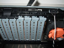 Die Laufwerksschächte sind für drei Festplatten und ein optisches Laufwerk ausgelegt. Zur Not würden sich unterhalb des DVD-Laufwerks auch weitere Festplatten verstauen lassen.