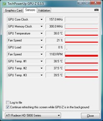 Die Übertaktung hat wie bei Radeon HD 5870 und 5770 erfreulicherweise auch bei der 5850 keinen Einfluss auf die Reduzierung von Chip- und Speichertakt im Desktop-Modus. Die Taktraten wurden auch bei 775/1125 MHz weiterhin auf 157/300 MHz abgesenkt, wenn der Grafikchip nicht belastet wurde.