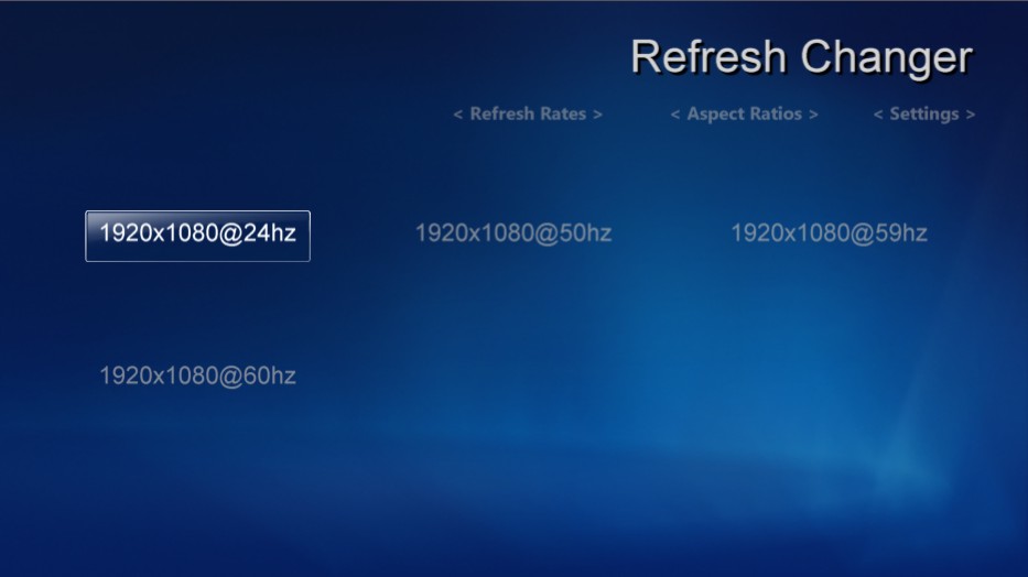 Ein nützliches Tool ist ebenfalls Refresh Changer UI, welches erst nach der Registrierung des im Link enthaltenen Forums runtergeladen werden kann. Dieses Tool ermöglicht es, Auflösung und Bildwiederholfrequenz direkt im Media Center zu wechseln, ohne Maus oder Tastatur beanspruchen zu müssen. So kann für eine Blu-ray 24p genutzt werden und für das normale TV 50 Hertz. Leider funktioniert dies noch nicht automatisch.