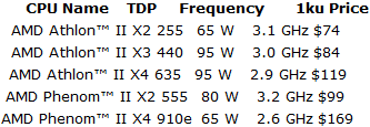 SUNNYVALE, Calif. — Jan. 25, 2010What: AMD (NYSE:AMD) today expanded its AMD Phenom™ II and AMD Athlon™ II processor families for desktop with several new processors designed to give mainstream consumers advanced performance capabilities from their desktop PCs at increasingly attractive price points. As desktop PCs continue trending toward smaller form factors, AMD remains committed to maximizing the user experience by bringing platform technology integration, efficiency and performance benefits to consumers. Examples of the new processor offerings from AMD include: