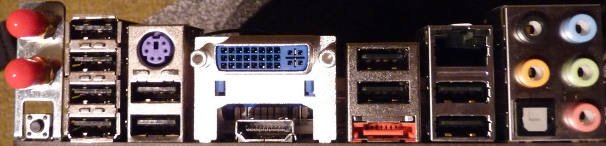 Das ATX-Panel verfügt über ganze zehn USB 2.0 Ports, einen eSATA-, einen PS2-, ein Gigabit-LAN- und die beiden WLAN-Antennenanschlüsse. Unter diesen sitzt ein Taster, um das BIOS zu reseten. Der Sound kann über fünf analoge Ein-/Ausgänge abgegriffen werden. Zusätzlich ist ein optischer Digitalausgang vorhanden. Die Grafik kann über HDMI und DVI sowie mittels Adapter per VGA ausgegeben werden.