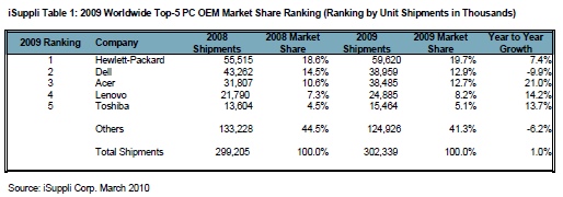 Laut den Analysten des Unternehmens iSuppli hat sich der PC-Markt 2009 im Vergleich zu 2008 leicht erholt: 2009 konnte man eine Zuwachsrate von 1 % verbuchen. Trotz der Finanzkrise konnten die Hersteller 2009 302,3 Millionen Einheiten ausliefern – 2008 waren es 299,2 Millionen. Besonders im dritten und vierten Quartal lagen die Zahlen besser als erwartet. Die größten Zuwachsraten der Hersteller konnte Acer für sich beanspruchen. Acers Zahlen stiegen um 21 %. So konnte das Unternehmen 2009 38,5 Millionen PCs ausliefern.