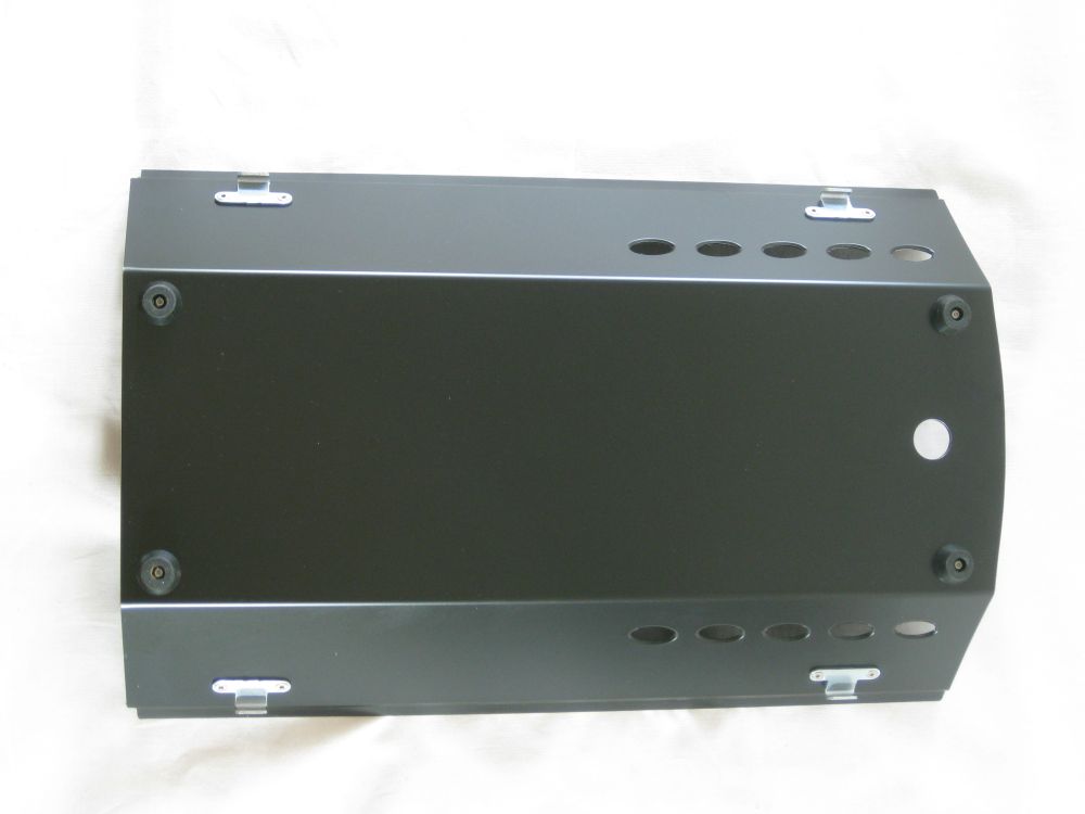Der Boden des Gehäuses kann wie oben beschrieben durch das Öffnen der beiden Seitenteile entfernt werden. Das Loch am Ende des Bodens ist für einen weiteren (fünften) gummierten Standfuß vorgesehen, welcher sich direkt am Gehäuse befindet. So ist es nicht möglich, den Boden falsch herum zu montieren. Auch im Boden befinden sich noch Lüftungslöcher, die wie alle Lüftungslöcher im Gehäuse über keinen Staubfilter verfügen.
