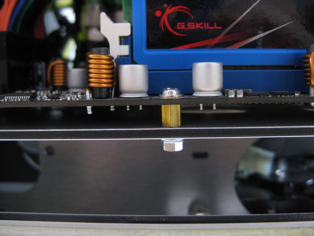 Bei unserem Gehäuse wurden handelsübliche Abstandhalter mitgeliefert. Da sich im Gehäuse aber nur Löcher und keine Gewinde befinden, konnte das Mainboard nur gesteckt werden, was natürlich keine otimale Lösung darstellt. Es handelte sich bei unserem Exeplar allerdings um eine fehlerhafte Lieferung. Normalerweise werden Abstandhalter mitgeliefert, die unter dem Mainboardschlitten mit einer Schraube befestigt werden können, wie es auch beim Komplettsystem der Fall war.