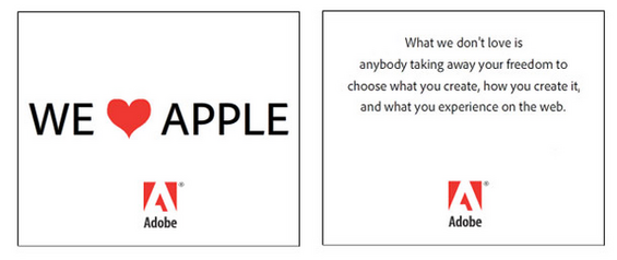Der Krieg zwischen dem Flash-Vater Adobe und dem verlorenen Sohn Apple, der die Software aus seinen Gadgets verbannt hat, geht weiter. Laut eigenen Aussagen liebt Adobe Apple, will aber die Freiheit des Internets erhalten. Mit einem offenen Brief und einer Werbekampagne, die offiziell eine Liebeserklärung an Apple und inoffiziell ein zynischer Seitenhieb ist, facht Adobe das Feuer zwischen den Unternehmen weiter an. So erklärt Adobe: „Keine Firma, egal wie groß oder kreativ, sollte den Anwendern vorschreiben was sie erschaffen, wie sie es erschaffen oder was sie im Internet erleben“.