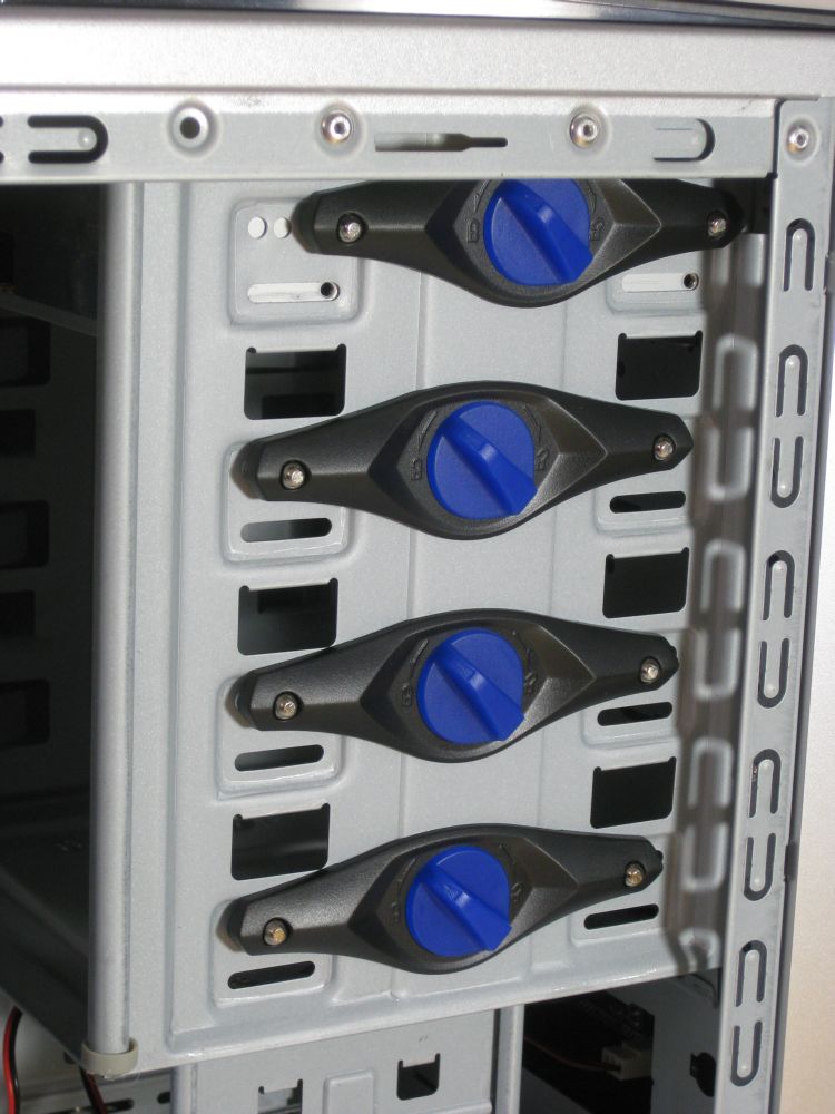 Der Festplatteneinbau ging dank der Schnellverschlüsse ebenfalls sehr schnell. Für den Einbau muss die Halterung links am Käfig gelöst, die Festlatte in den Käfig geschoben und die Halterung wieder befestigt werden. Die Schnellverschlüsse hielten aber auch die Festlatte nicht komplett fest an ihrem Platz, sie konnte noch leicht bewegt werden.