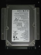 Direkt über dem DVD-Laufwerk wird die Festplatte verbaut. Auch für den Festplatteneinbau müssen die beiden Halterungen von jeweils zwei Schrauben gelöst werden. Die Festplatte wird dann zwischen die beiden Teile geschraubt und alles zusammen in dem Gehäuse verbaut.