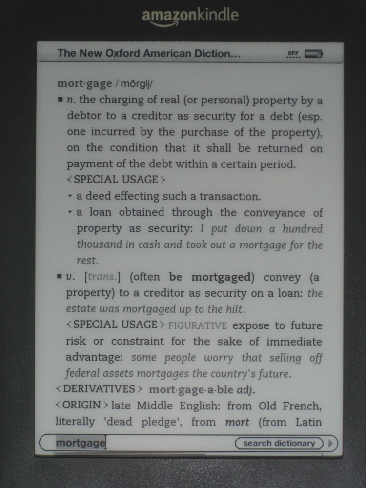 Amazon hat zwei Englisch-Englisch Wörterbücher vorinstalliert, zwischen denen man auswählen kann, entweder verwendet man das „Oxford Dictionary of English“ oder das „The New Oxford American Dictionary“. Für die Anwendung setzt man den Cursor vor ein bestimmtes Wort in Büchern oder auch PDF-Dateien und kann sich so automatisch am unteren oder oberen Rand des Dokumentes eine kurze Erläuterung anzeigen lassen. Über die „Enter“-Taste kann zu einer ausführlicheren Erklärung gewechselt werden.